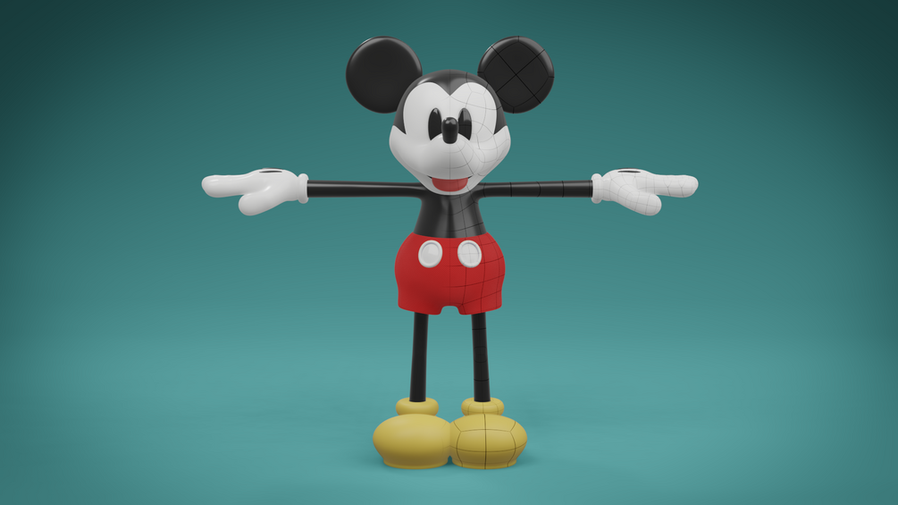 Mickey Mouse model and rig that I made in Blender originally for a class a long time ago. It's a medium-featured rig (Rigify-based): it has IK-FK controls and IK-FK switches, etc. but no facial controls: it only opens the jaw, the tongue and moves the eyes.